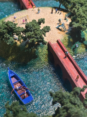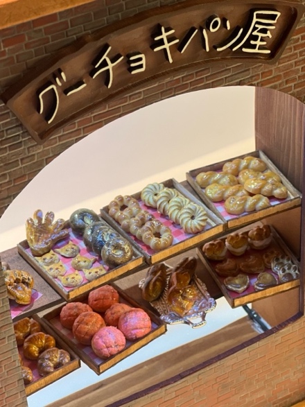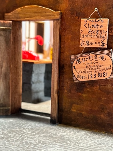 見どころジオラマを取り巻くように並んだ10個のボックスのなかには、『魔女の宅急便』のさまざまな名場面をかたどったミニチュア模型も展示されています。キキのお店の奥ではどのような暮らしが営まれていたのでしょう? 公園のジャングルジムからはどのような風景が見えたのでしょう? 挿絵をそのまま立体化したミニチュア模型をのぞき込めば、その奥に広がる物語の世界を感じることができます。